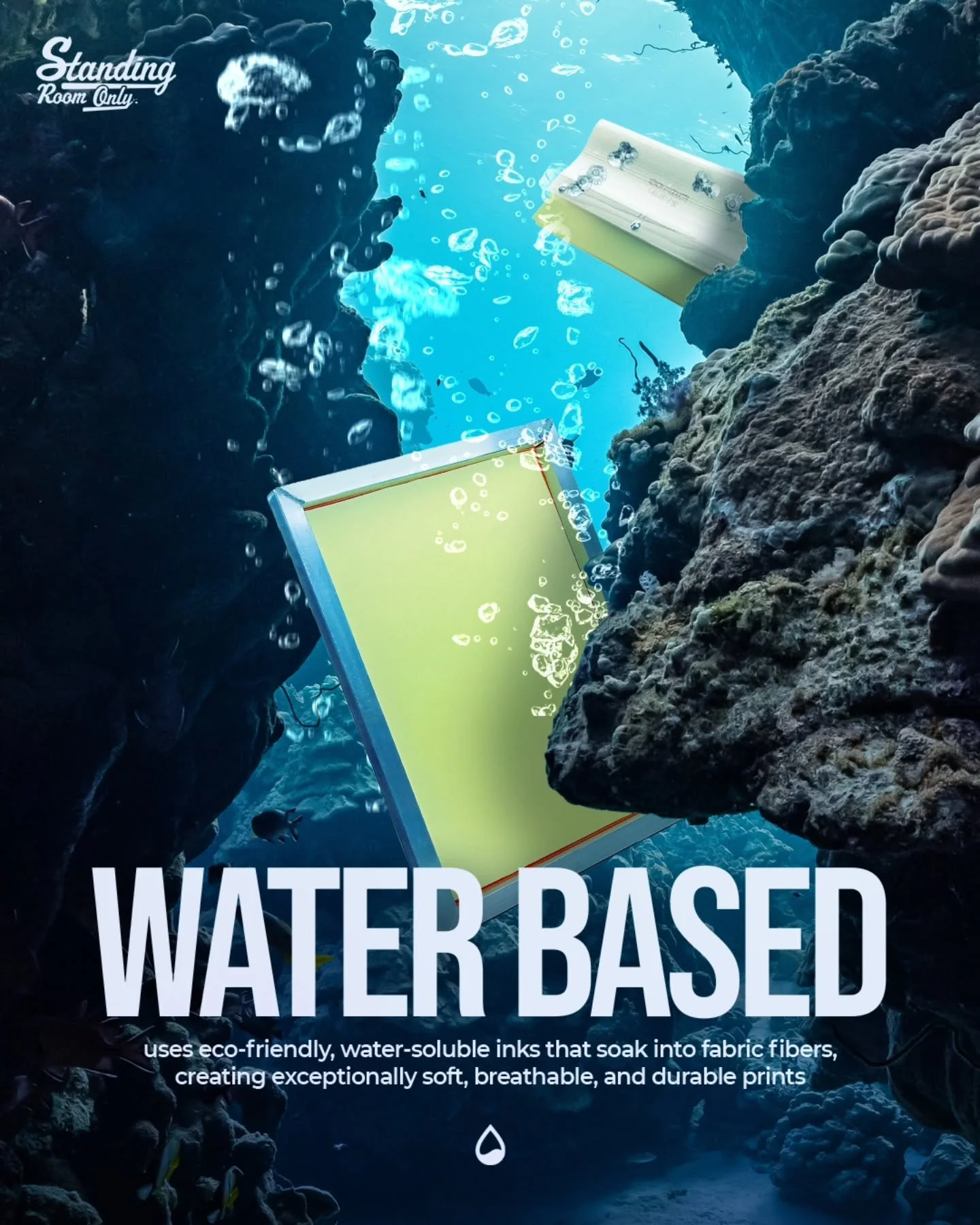 Water-based screen printing soaks into the fabric for a lightweight, breathable print that feels as good as it looks. Perfect for brands that care about comfort, detail, and quality. 🌊👕