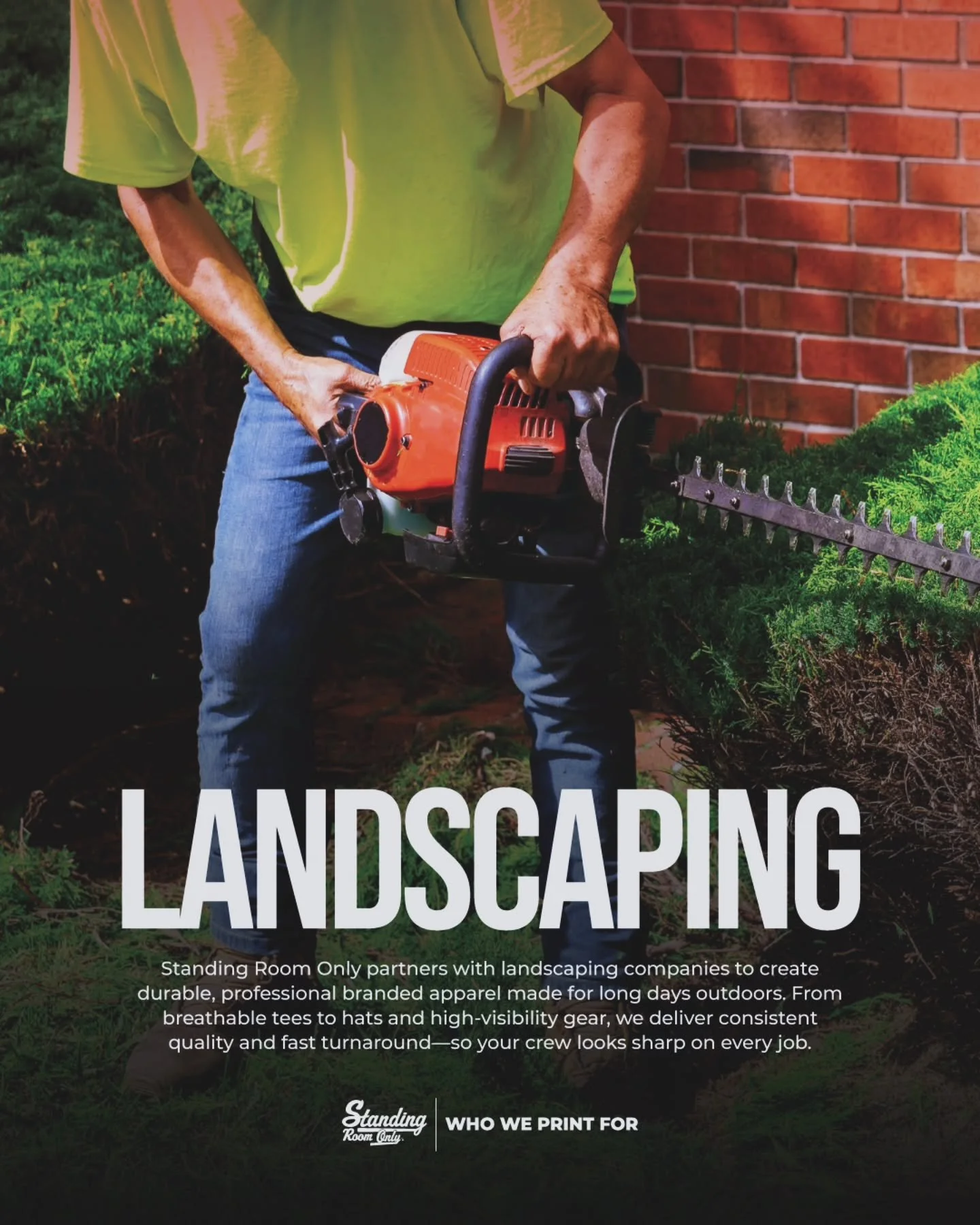 Standing Room Only partners with landscaping crews to deliver durable, professional apparel that works as hard as you do. From breathable tees to high-vis gear and hats, every piece is made for long days, tough conditions, a